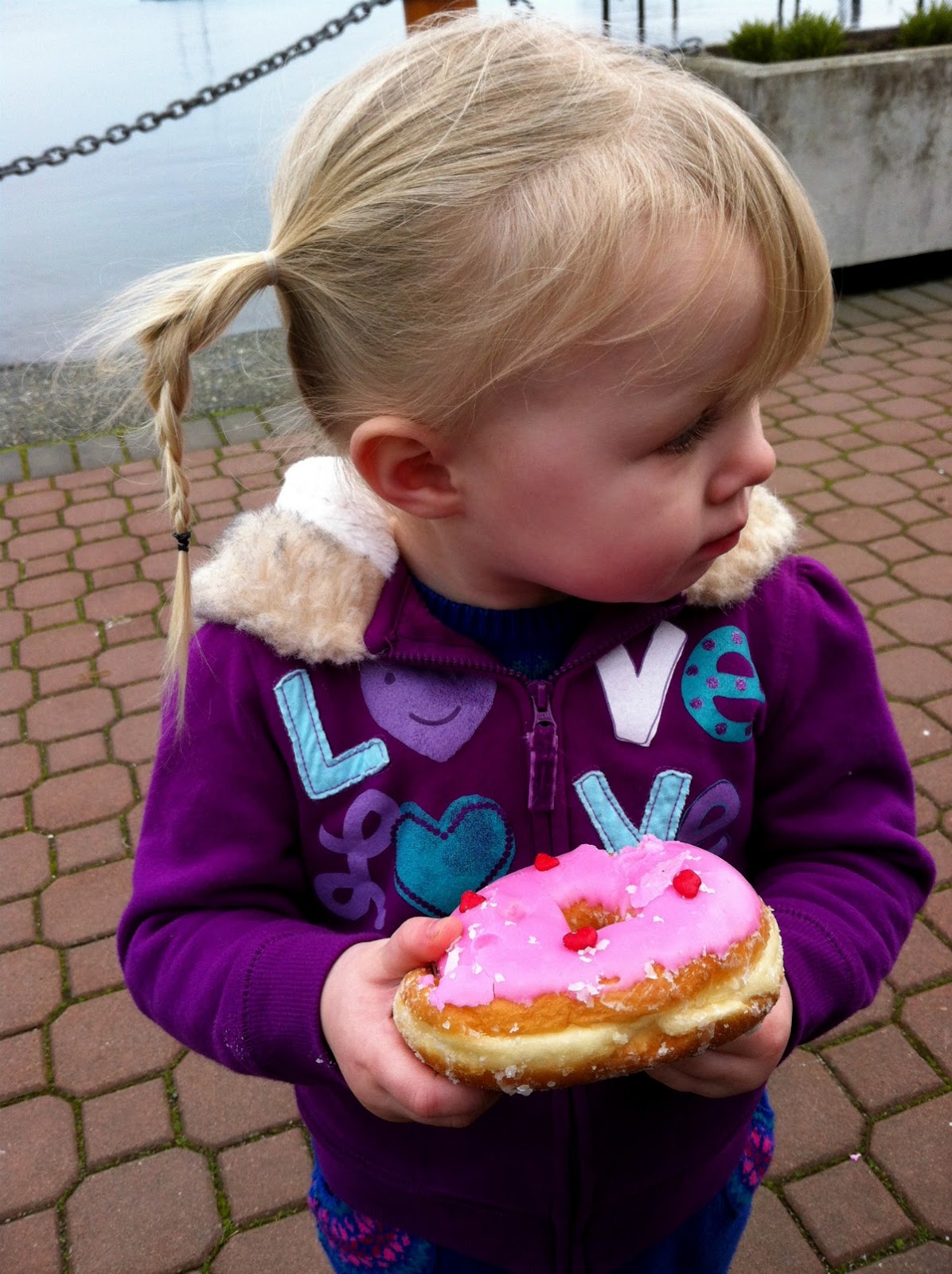 Before we headed down the stairs to the beach, we stopped at the local bakery. Valentine’s Day donuts were on the menu, as is what seemed to be the World’s Largest Apple Fritter (as you can see in my hubby’s paw).